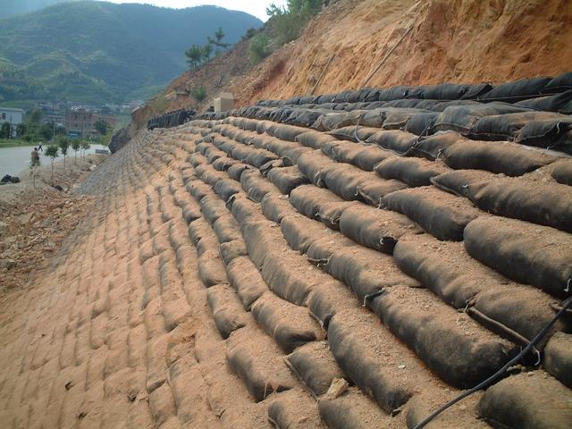 渣山1~2层位于底部,坡度45°左右。应用生态植草袋,对边坡塌方、土壤流失具有很大的预防和稳定作用,可成为高稳定自然边坡。施工前,先整平原有土壤,并覆100毫米厚的种植土,在每层坡上按坡高等距离固定2排直径为22毫米的螺纹钢,坡下设挡土梁,防止因重力作用发生山体滑坡;在无纺布袋内装种植土、摆袋、挖孔、点播草籽。