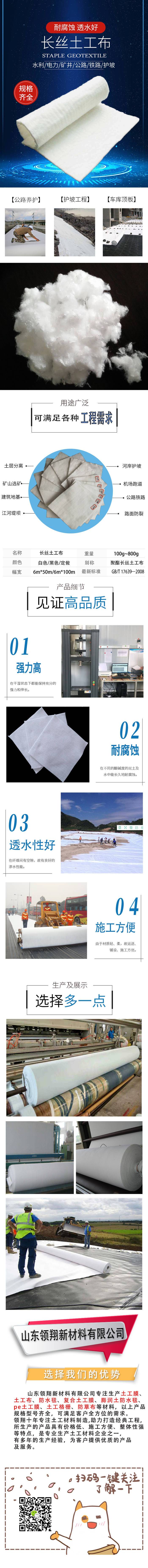 长丝土工布为聚酯长丝针刺无纺土工布,不含化学添加剂,也不经热处理,是环保型的建筑材料。土工合成材料长丝防粘针刺非织造土工布,最新标准GB/T17639—2008。长丝土工布具有良好